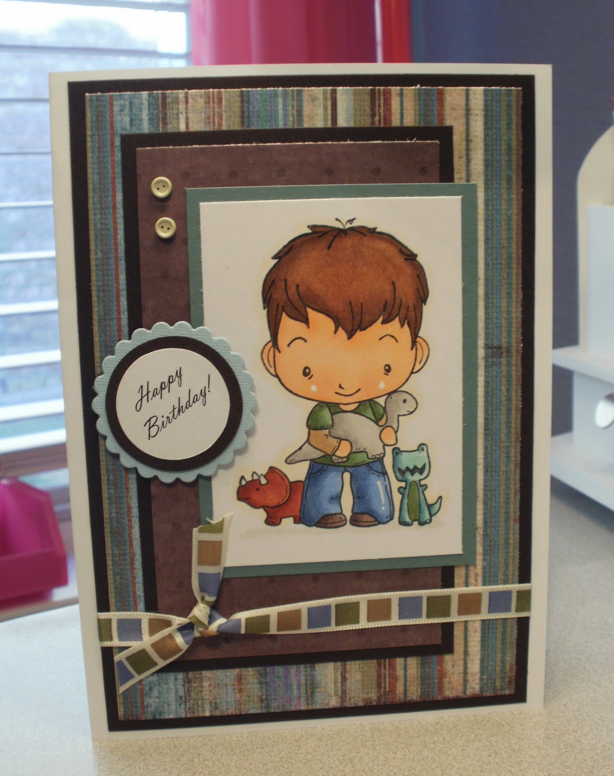 Image is colored with copics, patterned paper is by My Mind's Eye, Ribbon is Making Memories (I think). :)